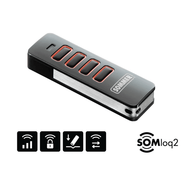 Erős, fémházas kialakítású távirányító, amely 4 nyomógombbal és praktikus kulcskarikával rendelkezik. Az új SOMloq2 kódolással működik, ugyanakkor visszafelé kompatibilis a korábbi 868 MHz-es Sommer rendszerekkel is. Tartós és megbízható megoldás mindennapi használatra.